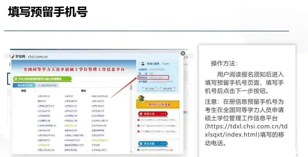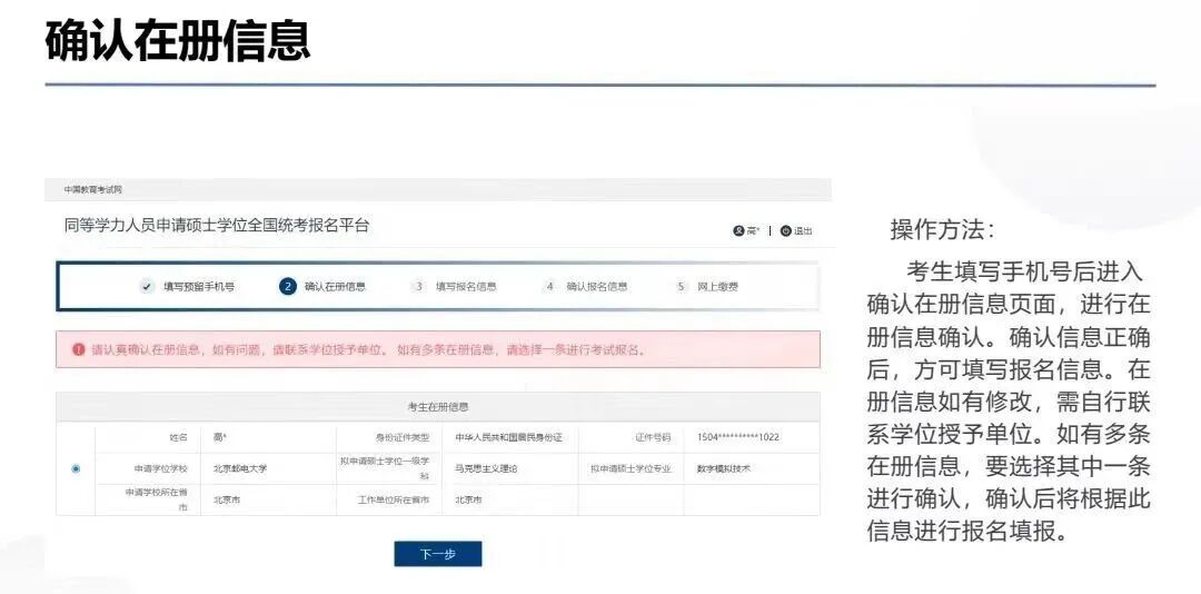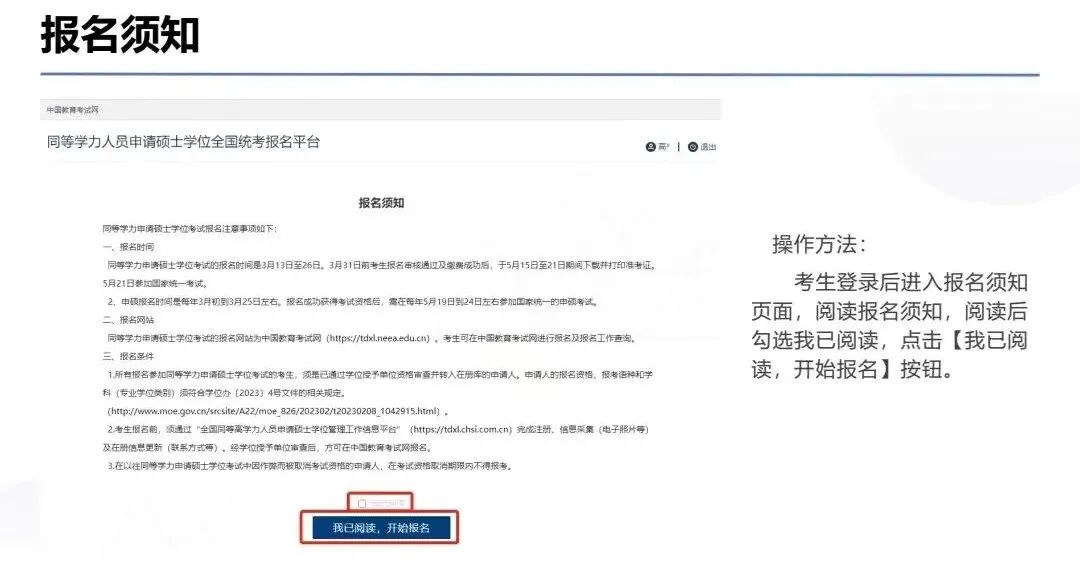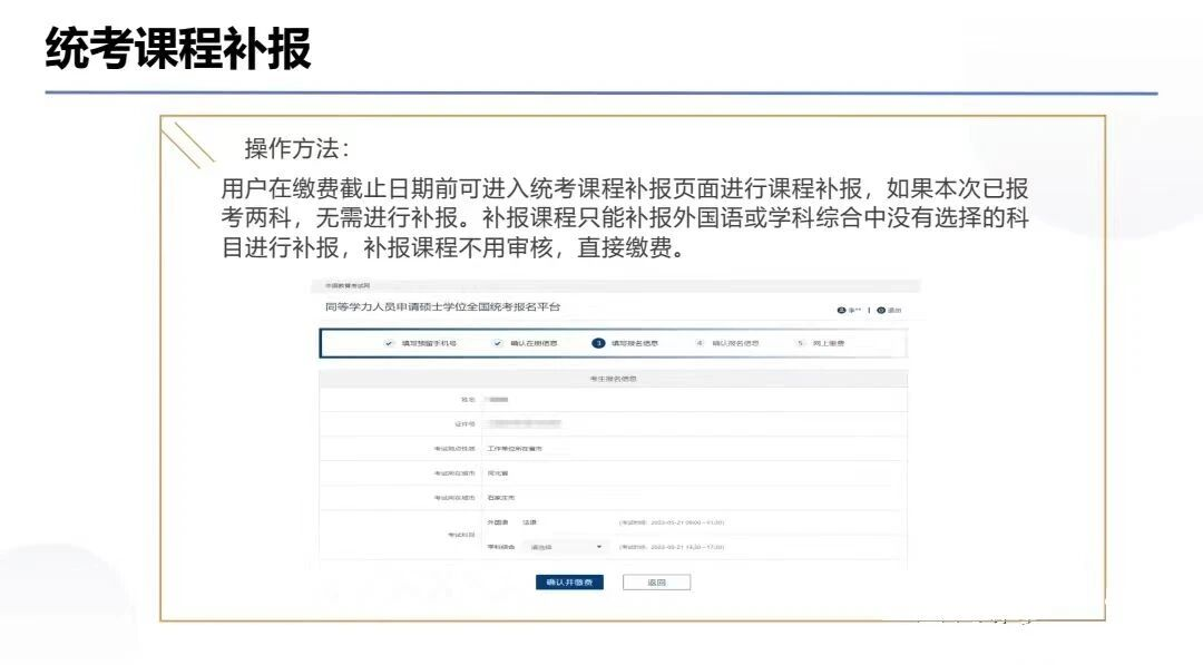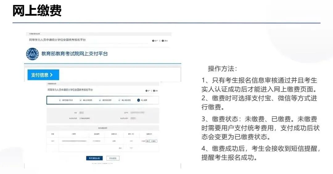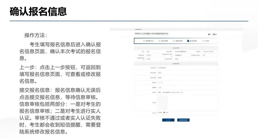 整个报名流程可概括为“前期准备、正式报名、支付确认、考前准备”四个阶段。 第一阶段:前期准备与信息核验(3月5日已截止) 立即登录“信息平台”,检查个人账户状态及所有信息是否准确无误。这是后续一切操作的基础,逾期不可重新注册及修改,务必重视。 第二阶段:正式报名与选考点(3月16日 - 3月26日16:00) (一)使用“信息平台”的账号信息,登录“报名系统”,点击“同等学力申请硕士学位考试”,点击进入该平台,在考生服务选择统考报名,如下图: 1.考生注册 注意事项:首次报考的考生,须注册账号(历年已报考的考生无需再次注册,可沿用老账号直接登录)。 (1)注册填写基本信息时,用户名建议使用电子邮箱,注意不要填错; (2)一个身份证件号码只能注册一个账号,不能重复注册; (3)电子邮箱和手机号码务必保证准确,将用于收取激活邮件和找回密码。 2.登录账号 点击“进入系统”打开同等学力信息平台页面,填写对应信息后点击登录。 3.报名须知 考生登录后会进入报名须知页面,请仔细阅读报名须知,阅读后勾选我已阅读,点击【我已阅读,开始报名】按钮。 4.填写预留手机号 用户阅读报名须知后会进入填写预留手机号页面,填写手机号后点击下一步按钮。 5.确认在册信息 注意事项:在册信息预留的手机号为考生在全国同等学力人员申请硕士学位管理工作信息平台所填写的移动电话。 考生填写手机号后会进入确认在册信息页面,确认信息正确后,方可继续填写报名信息。在册信息如有修改,需自行联系学位授予单位。如有多条在册信息,要选择其中一条进行确认,确认后将根据此信息进行报名填报。 6.填写报名信息 考生确认在册信息后进入填写报名信息页面,填写本次考试的报名信息:考试地点性质、考试所在省市、考试所在城市、通讯地址、邮政编码、考试科目、上传照片(如照片审核未通过,可去正规照相馆按要求重新拍正规证件照再次上传)。 7.确认报名信息 各位学员需要仔细核对填写的报名信息,以免出现错误。选择您要报考的语种和学科,并根据自身情况选择合适的省份作为考试地点。确认所有信息后提交。 第三阶段:在线支付与最终确认(3月26日报名后 - 3月30日24:00) 1.网上缴费 提交报名信息后,请及时在“报名系统”内完成在线支付。同等学力全国统考按每位考生每科目100元收取报名考试费,缴费成功后考生会收到短信提醒,缴费成功后即代表统考课程网报成功。支付成功后,方视为报名流程最终完成。建议支付后再次登录系统,确认报名状态是否为“缴费成功”。 2.补充材料 实人认证不通过:如果出现实人认证不通过的情况,用户可以提交补充材料,进行人工审核。 补充材料:本人手持身份证的照片,上传成功后点击提交按钮,提交后将进行人工审核。 3.补充统考课程补报 在缴费截止日期前,考生可以进行统考课程补报,如果已报两科,无需补报。补报课程时只能补报没有选择的科目,补报不用审核,可直接缴费。 第四阶段:考前准备(5月11日起) 准考证下载功能将于2026年5月11日至5月17日开放,请考生及时登录“报名系统”下载并打印准考证。同时,请在考前一周,密切关注考试所在地省级教育招生考试机构官网,查询具体的防疫要求、考场规则等考前须知。 重要注意事项提醒 1.信息一致性是生命线:务必保证你在“信息平台”和“报名系统”中的个人信息严丝合缝,任何不一致都可能导致报名失败或后续无法考试。 2.时间观念至关重要:上述三个截止时间点(3月5日、3月26日、3月30日)均为硬性截止,过期不候,请务必设置提醒,提前完成操作。 3.缴费即确认:只有完成缴费,报名才生效。请勿在报名后拖延支付。 4.官方渠道获取信息:考试大纲、成绩查询(预计9月上旬开放)、成绩复核等后续事宜,均需通过中国教育考试网、报名系统等官方渠道进行。 常见问题 1.登录时,提示信息不一致是什么原因? 所有报名参加同等学力人员申请硕士学位考试的考生,须是已通过学位授予单位资格审查并转入在册库的申请人,只有在册库的考生才有报名资格。 2.用什么版本的浏览器进行报名操作不容易出现浏览器兼容性问题? 建议使用谷歌或Edge浏览器。 3.填写预留手机号是哪个手机号? 预留手机号为考生在全国同等学力人员申请硕士学位管理工作信息平台注册时填写的移动电话。 4.要选择的考试科目没在考试科目列表中,怎么办? 报名系统会根据考生拟申请硕士学位一级学科进行考试科目的过滤,如果要选择的考试科目没在考试科目列表中,请仔细核对拟申请硕士学位一级学科是否正确。 5.实人认证失败怎么办? 实人认证失败后,可在填写报名信息页面补充实人认证材料(一张手持身份证照片),由人工进行实人认证审核。也允许考生删除已上传用于实人认证的照片,再重新拍照上传。 6.提交报名信息和实人认证有先后顺序吗? 提交报名信息和实人认证没有先后顺序,两者各走各的流程。只是考生只有报名信息审核通过并且实人认证成功,才能进行网上缴费。
